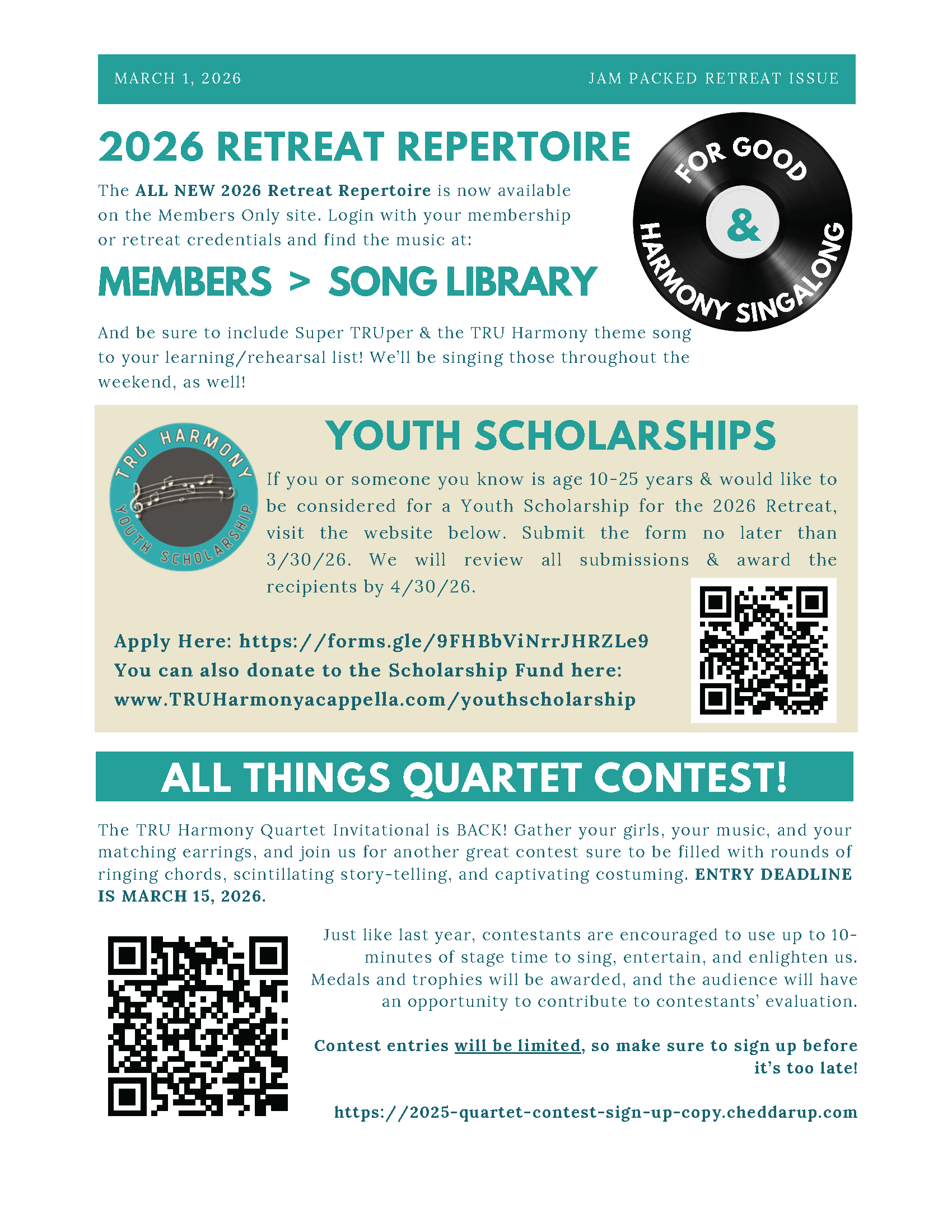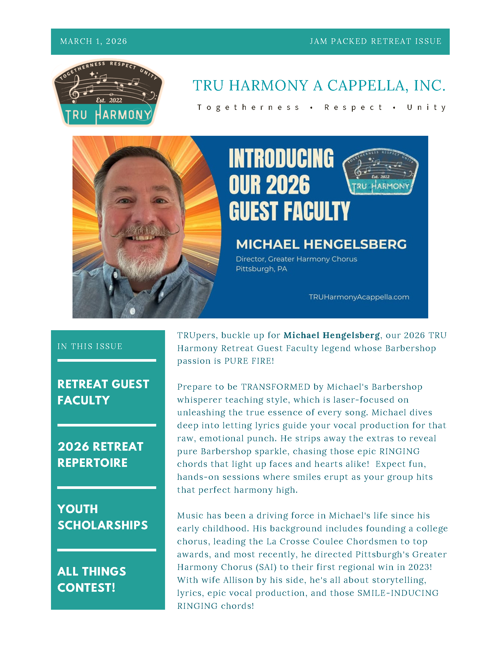 TRU Harmony A Cappella creates a newsletter periodically to keep our friends, supporters and followers up-to-date with the activities and events of the Members. It is delivered via our friends email mailing list.