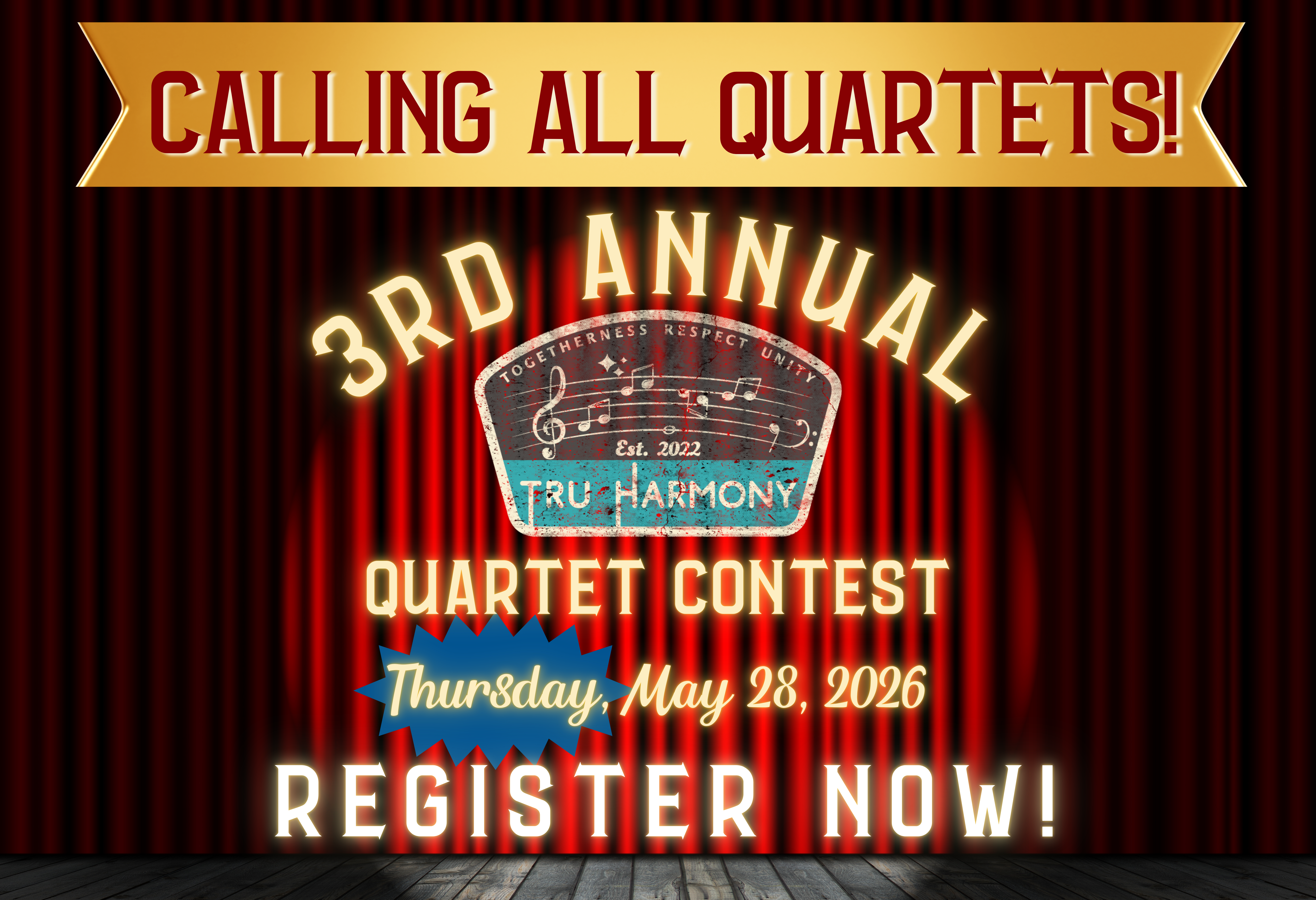 We're thrilled to announce the THIRD Annual TRU Harmony Quartet Contest at the 2026 TRU Harmony Retreat - this year on THURSDAY!!! Get ready for a whole new contest vibe this year! It's going to be EPIC!